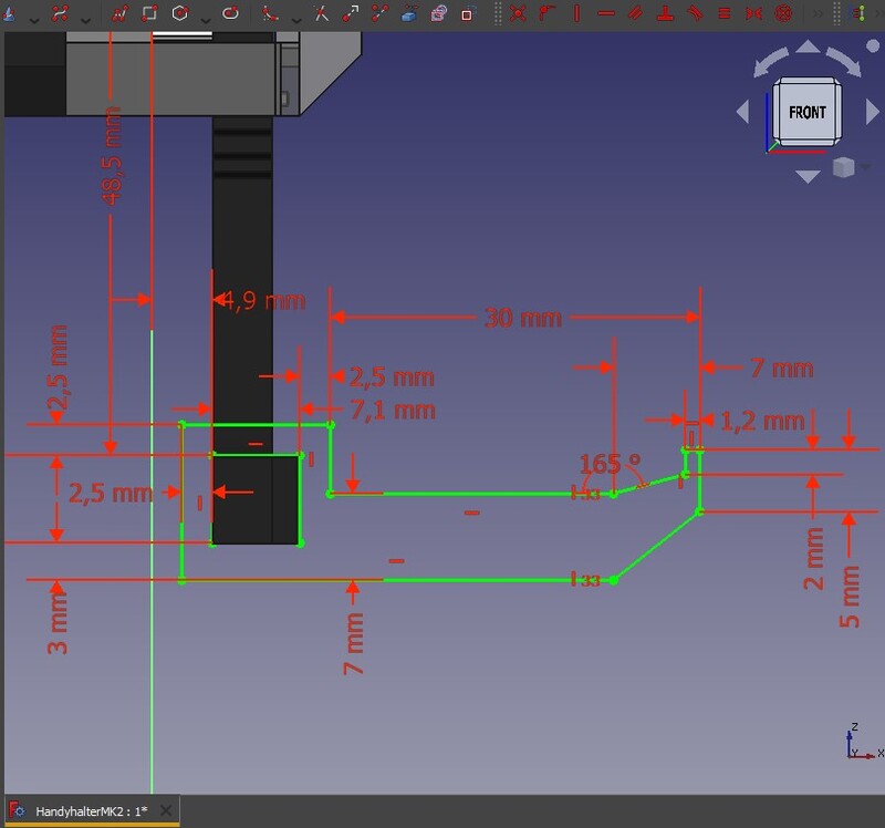 Mit diesen neuen Erkenntnissen kann es an die Konstruktion des eigentlichen Halters gehen. Ich nutze FreeCAD für die Konstruktion. Das Programm ist äußerst mächtig und gut zu benutzen (wenn auch nach einer gewissen Lernkurve) – und es kostet nichts. Insgesamt dreizehn Bauteile müssen konstruiert werden. Dafür brauche ich etwa vier bis fünf Stunden.