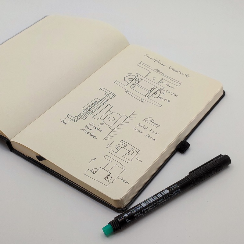 Dann kam mir der Gedanke, das Gerät über einen Schiebemechanismus einzuklemmen. Aber wie die Klemmung fixieren? Vielleicht kann ja die Schwerkraft helfen, die ist schließlich kostenlos. Und das war die Geburtsstunde für den Mechanismus, so wie ich ihn schließlich gebaut habe. Erster Schritt beim Aufbau ist eine Skizze. Sie hilft mir, Klarheit über das Design und die wichtigsten Features zu bekommen. Man kann eben nicht alles im Kopf machen.